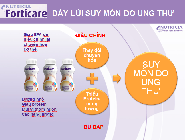 Quan trọng là làm thế nào giúp bệnh nhân ung thư có sức khỏe để đi đến các cuộc phẫu thuật hay xạ trị một cách hiệu quả trong khi hầu hết các bệnh nhân ung thư đều mất vị giác không còn muốn ăn uống lúc này những liệu pháp dinh dưỡng chuyên biệt cho người ung thư là quan trọng nhất và được các bác sĩ tin tưởng và tư vấn cho khách hàng. Hãng Nutricia Hà Lan dựa trên các yếu tố cần của đối tượng bệnh nhân ung thư đã cho ra sản phẩm Forticare là dinh dưỡng pha sẵn dễ sử dụng và tiện lợi cho cả bệnh nhân ung thư và người nhà bệnh nhân.