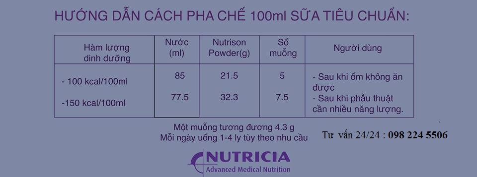 Để pha 100ml sản phẩm (100kcal/100ml): cho 85ml nước với 21,5gr Nutrison Powder (5 muỗng gạt ngang) pha theo hướng dẫn ở trên.