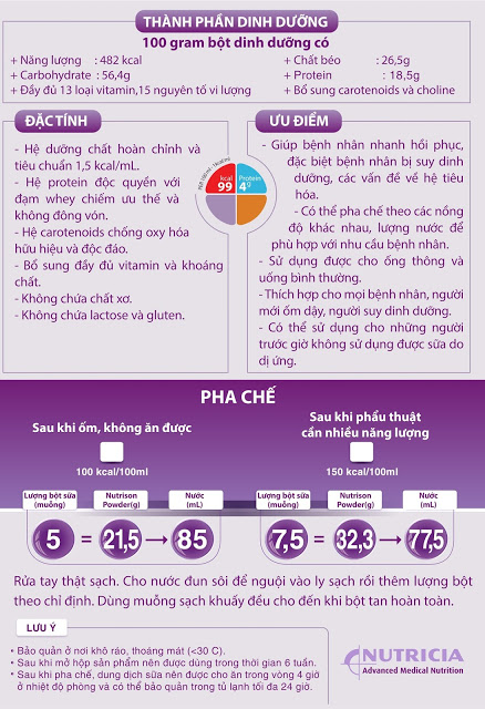 Sữa Nutrison là dạng dinh dưỡng bổ sung đường uống, cung cấp hệ dưỡng chất hoàn chỉnh cho người sau mổ, người già, ốm có vấn đề về hệ tiêu hóa