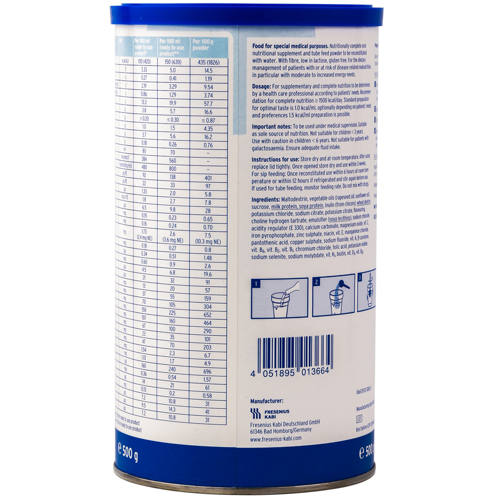 Fresubin Powder Fibre chứa thành phần giàu dinh dưỡng giúp bệnh nhân mau hồi phục, sử dụng theo đường uống năng lượng cao, bổ sung chất xơ. Không lactose và gluten. Nhập khẩu từ Đức