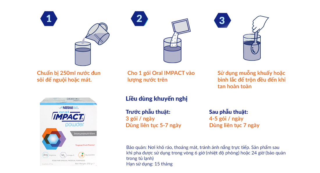 - Cách sử dụng: pha 1 gói Oral IMPACT trong 250ml nước đun sôi để nguội, khuấy đều, dùng ngay, sản phẩm ngon hơn khi uống lạnh.