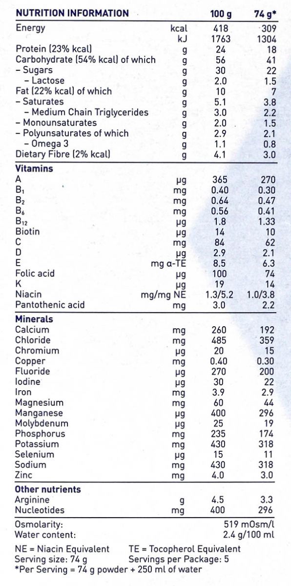 - Nhu cầu khuyến nghị: Sử dụng sản phẩm cho người lớn với 3 gói / ngày trong vòng 5-7 ngày trước phẫu thuật; tiếp tục với 4-5 gói/ngày trong vòng 7 ngày sau phẫu thuật trong trường hợp suy dinh dưỡng hoặc có nguy cơ suy dinh dưỡng.
